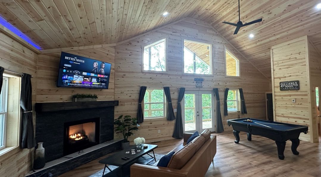 A 1,150 sq ft luxury cabin perfect for couples, and pet-friendly with a fully fenced yard. Just open the back door and let your pup safely explore while you relax by the firepit. Enjoy a private sauna, heated 2-person Jacuzzi spa, hot tub, pool table, and full-size arcade—surrounded by nature and complete privacy.