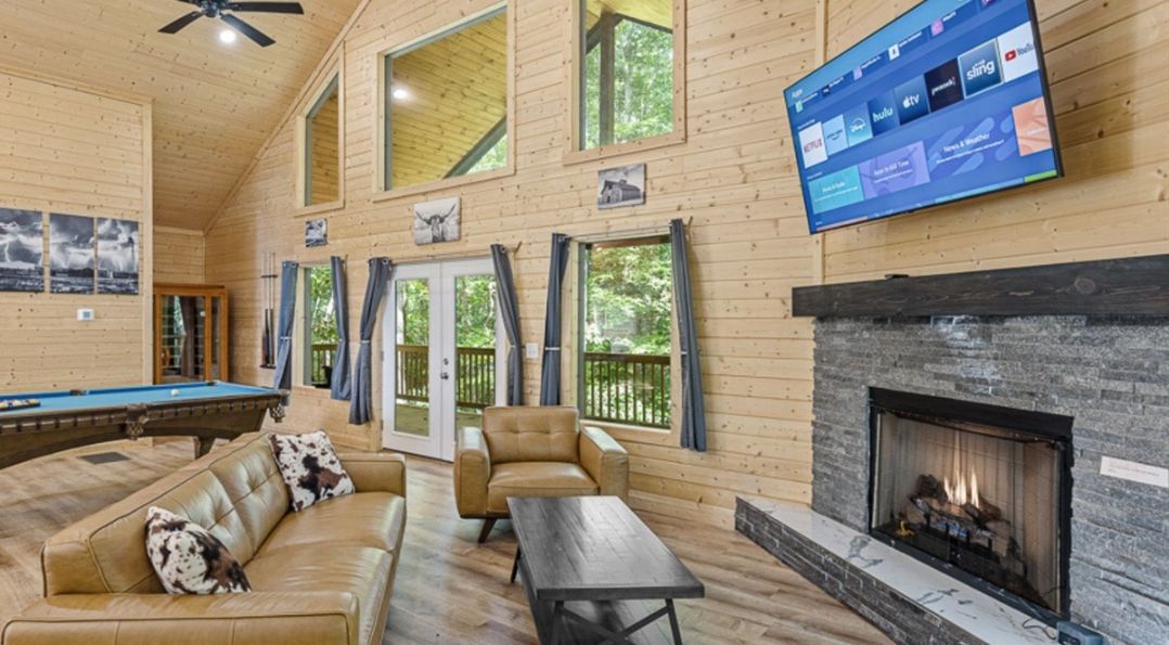 The Summit – Brand-new pet-friendly spa cabin for couples, featuring a fenced yard around the fire pit with back access for you and your pet. Enjoy a 2-person Jacuzzi spa, infrared sauna, Strong Spa G2 hot tub, slate pool table, and serene mountain privacy—just minutes from Helen GA.
