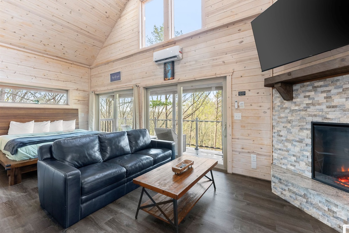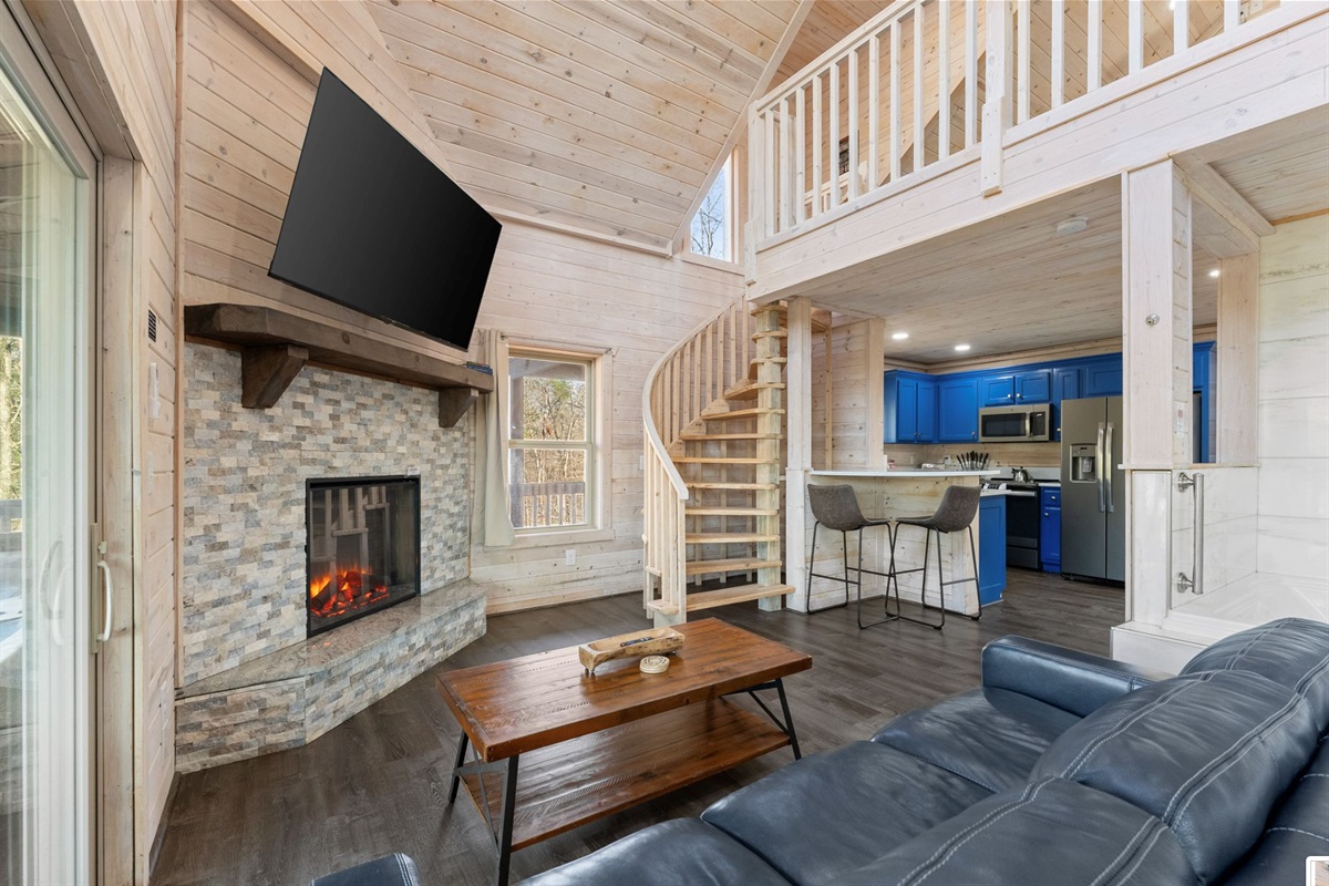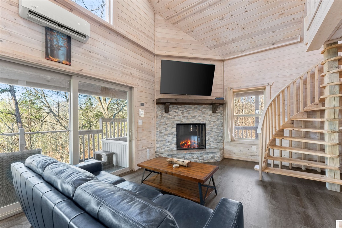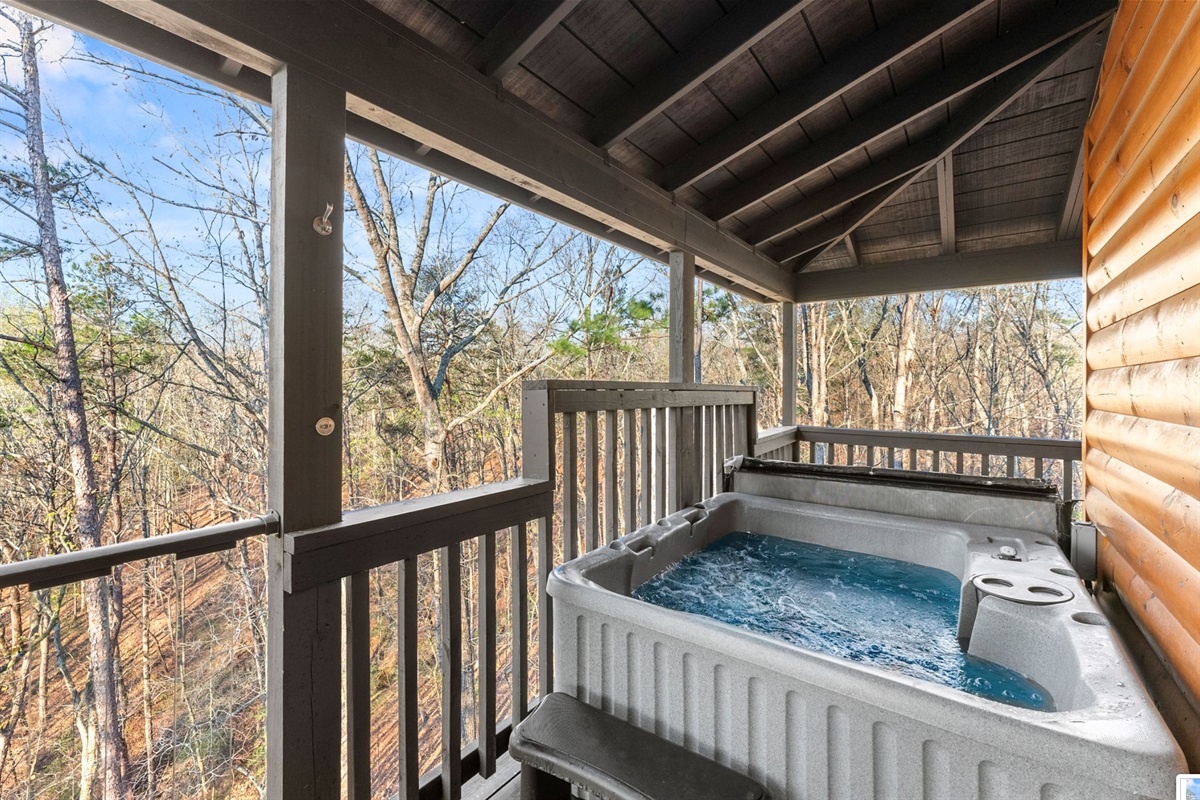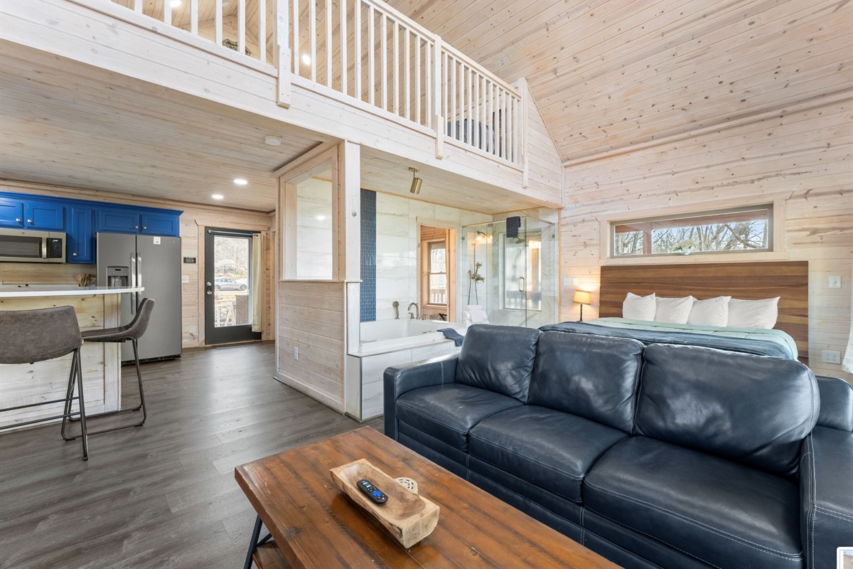 A kitchen filled with all the necessities and a comfy yet luxurious lounge area lets guests feel right at home in their tree top escape. The full bath is cozy but provides everything you need to freshen up including a walk-in shower, hot tub, and an inside jacuzzi tub. The sleeping loft has a full size futon. Listen to the amazing river sounds of the Chattahoochee River out back.