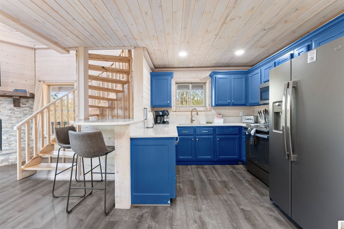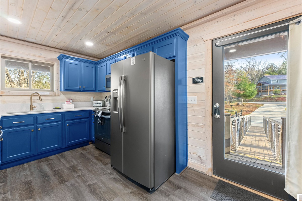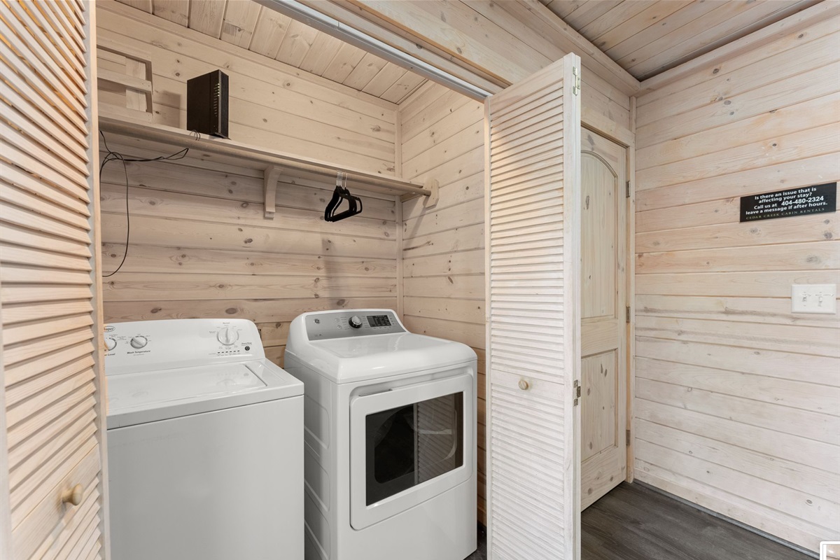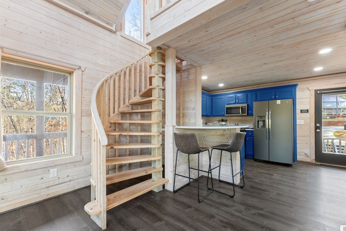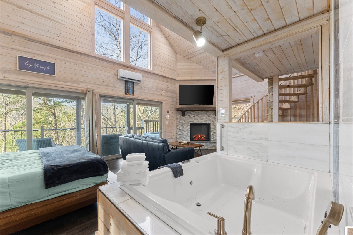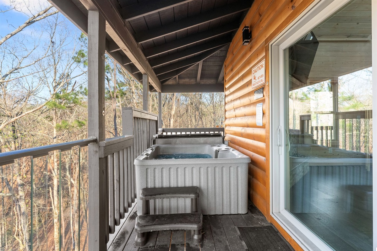 A kitchen filled with all the necessities and a comfy yet luxurious lounge area lets guests feel right at home in their tree top escape. The full bath is cozy but provides everything you need to freshen up including a walk-in shower, hot tub, and an inside jacuzzi tub. The sleeping loft has a full size futon. Listen to the amazing river sounds of the Chattahoochee River out back.