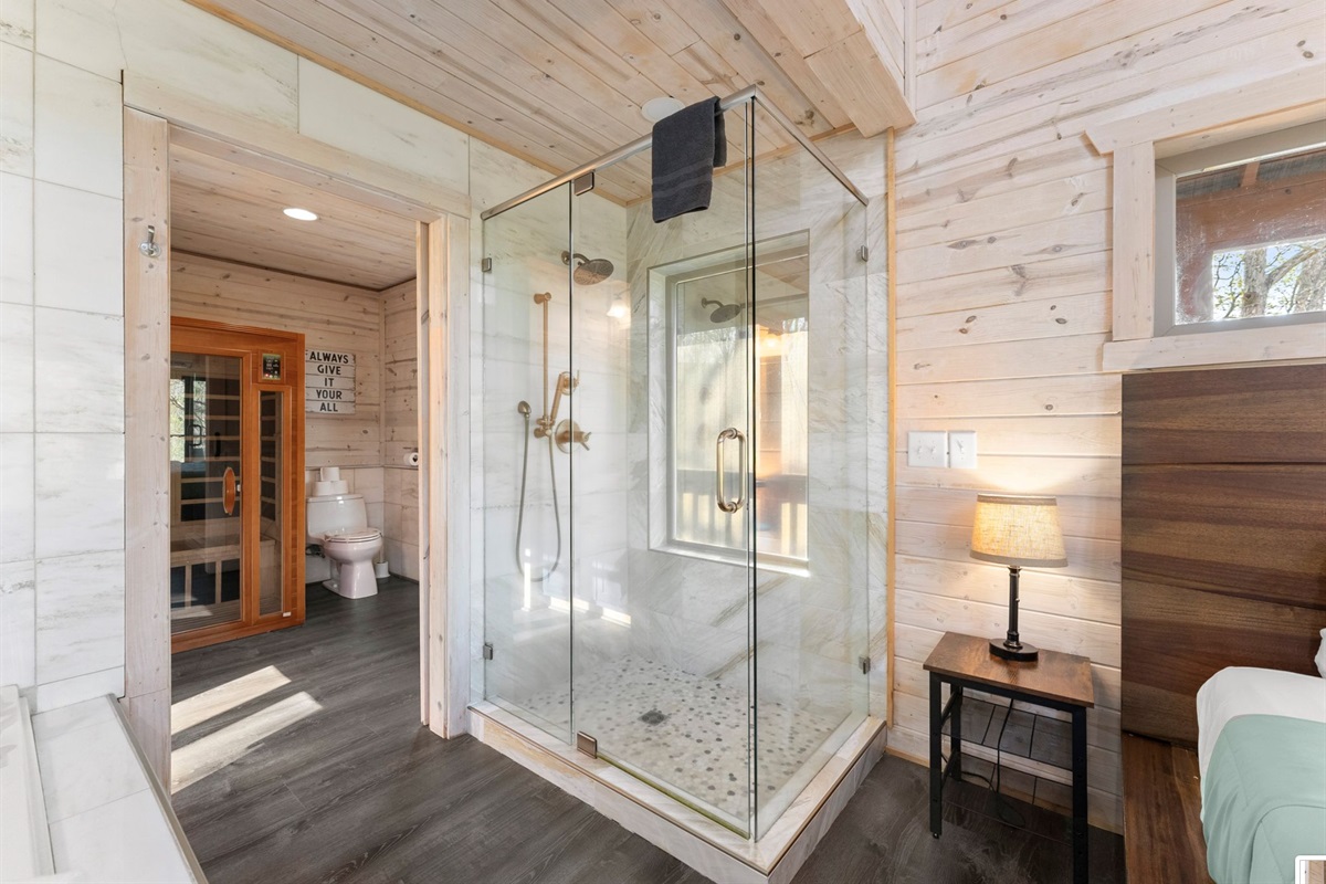 Luxury meets nature-chic in this cabin which offers an elevated lodge experience in the heart of the forest. Featuring an exclusive feature – shower up with the birds. The shower has a full length one way glass so that you can see the great outdoors.