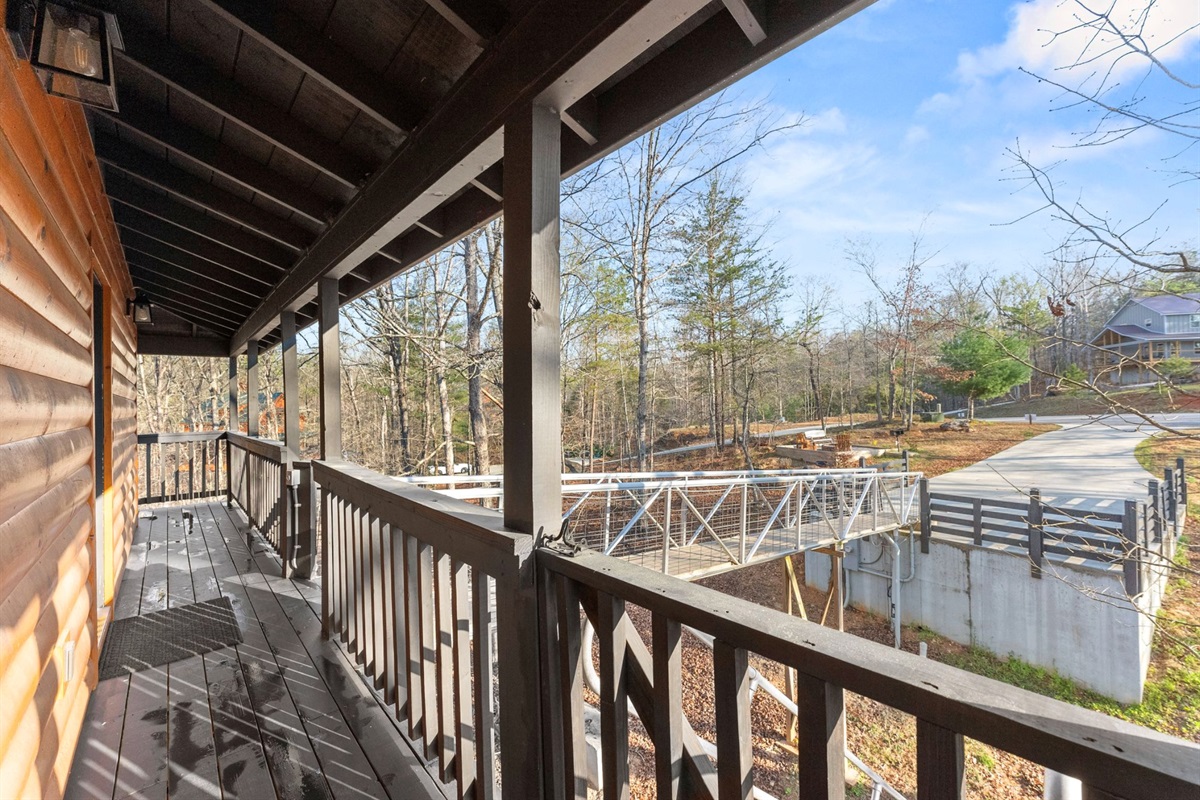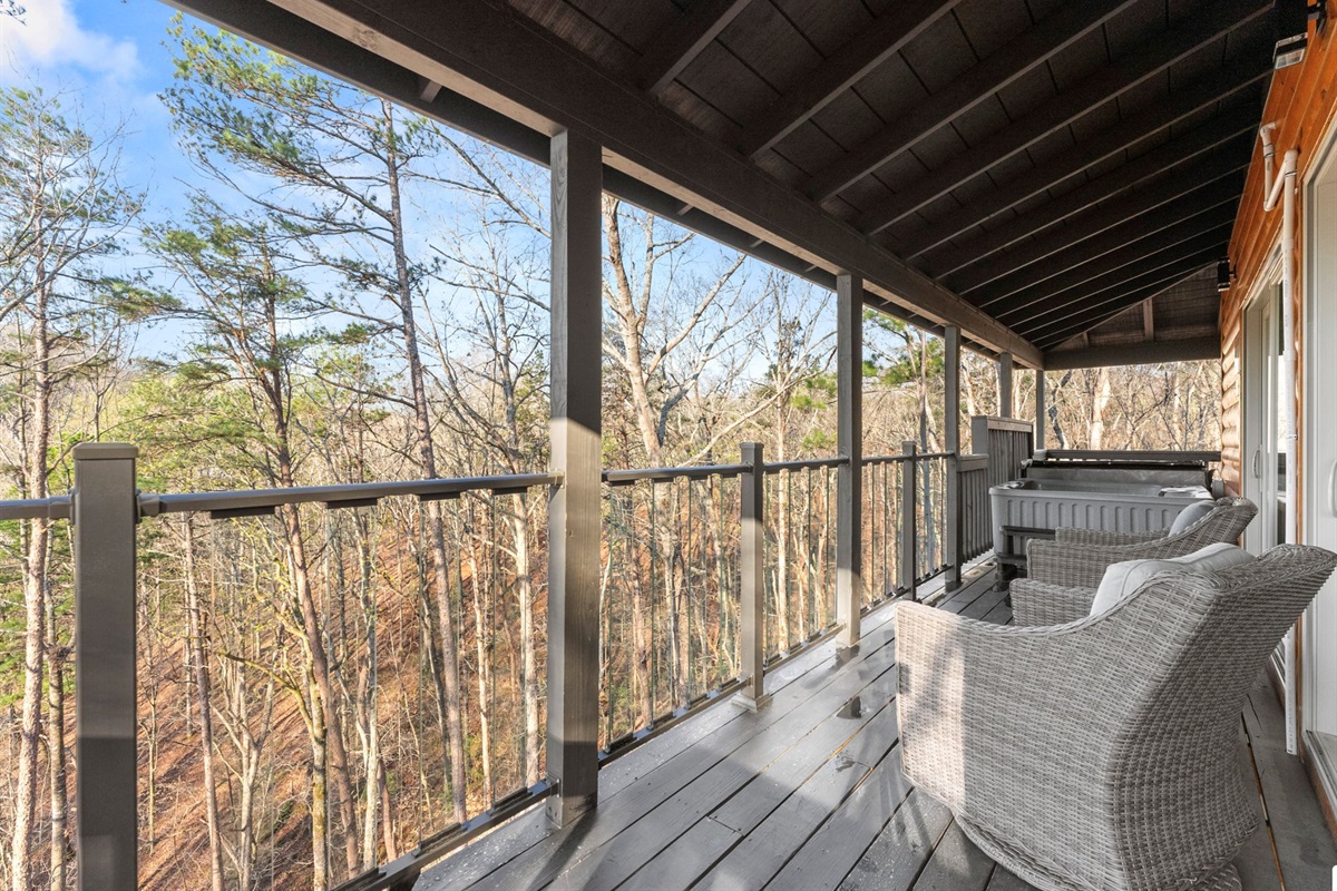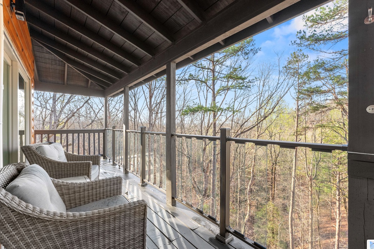 There is a glass baluster railing for ultimate viewing off the back deck. Opened up to even more viewing room with additional 10 ft of full length glass slider off the back.